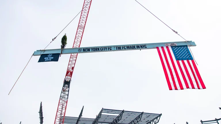 NYCFC completa la estructura de Etihad Park con la colocación de la viga final.